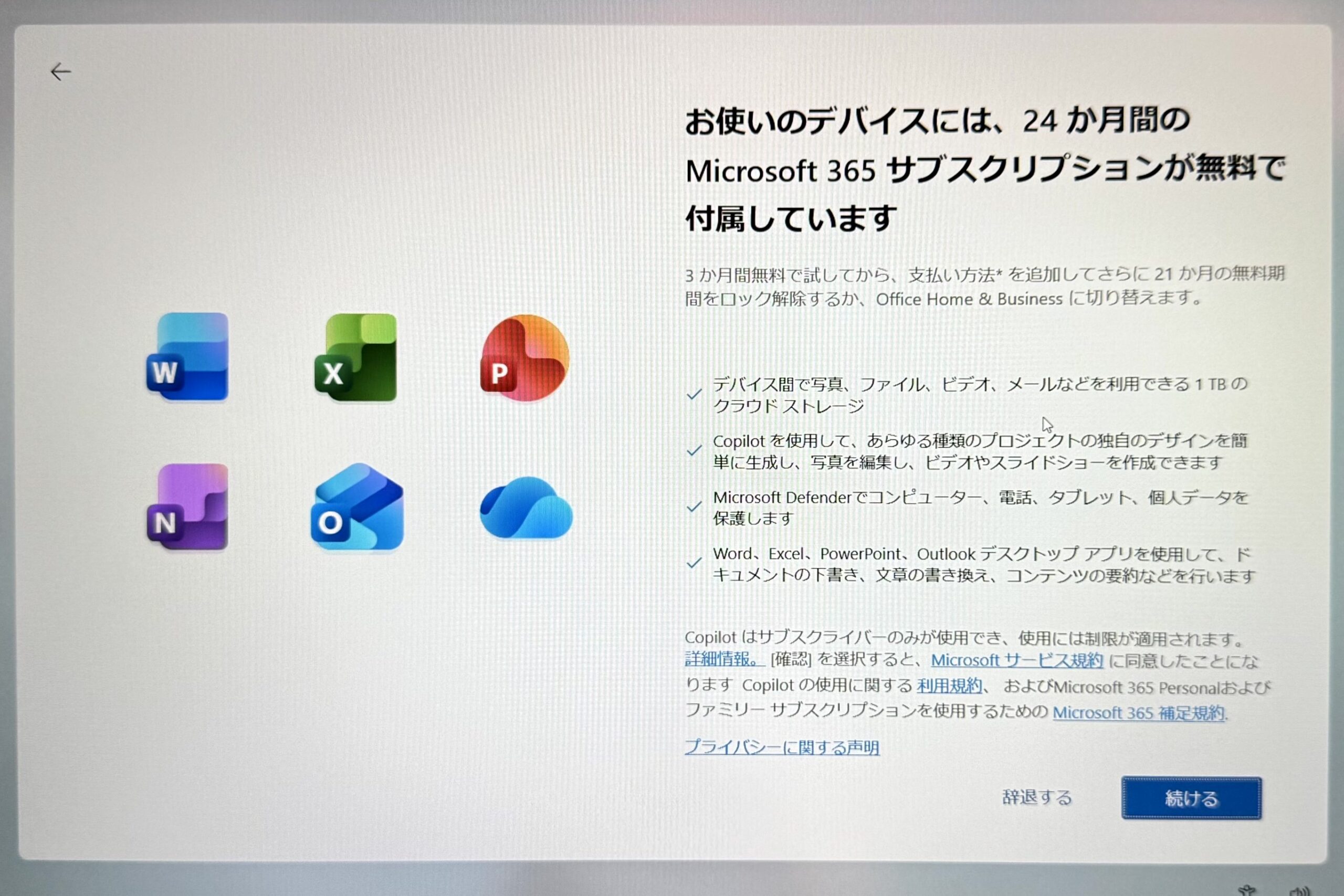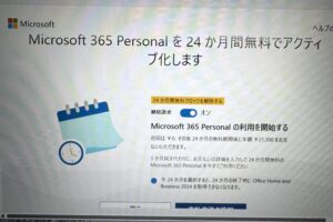 すると約3か月間のMicrosoft 365 Personalお試し期間 が付与されます。その後、継続利用したい場合は支払い方法を追加することで、最大で合計24か月間の無料利用権が付与されるようです。