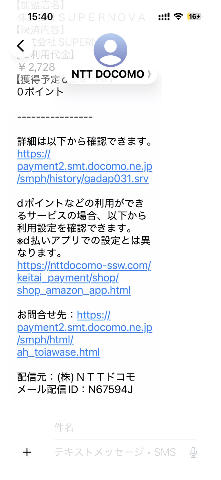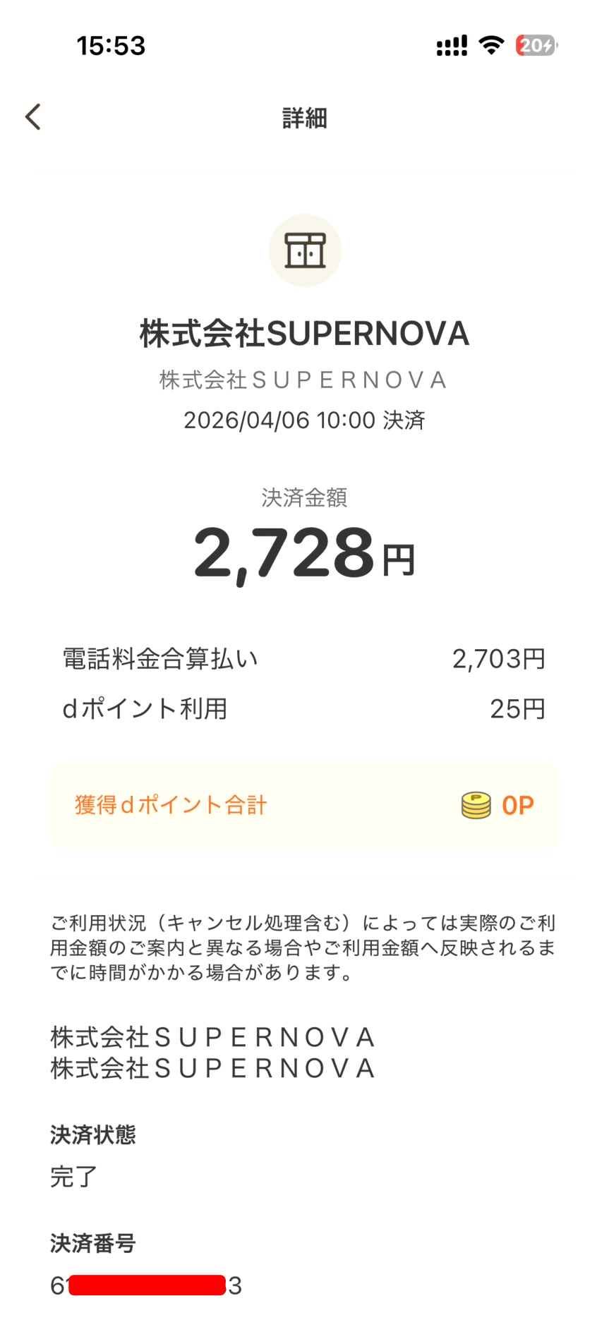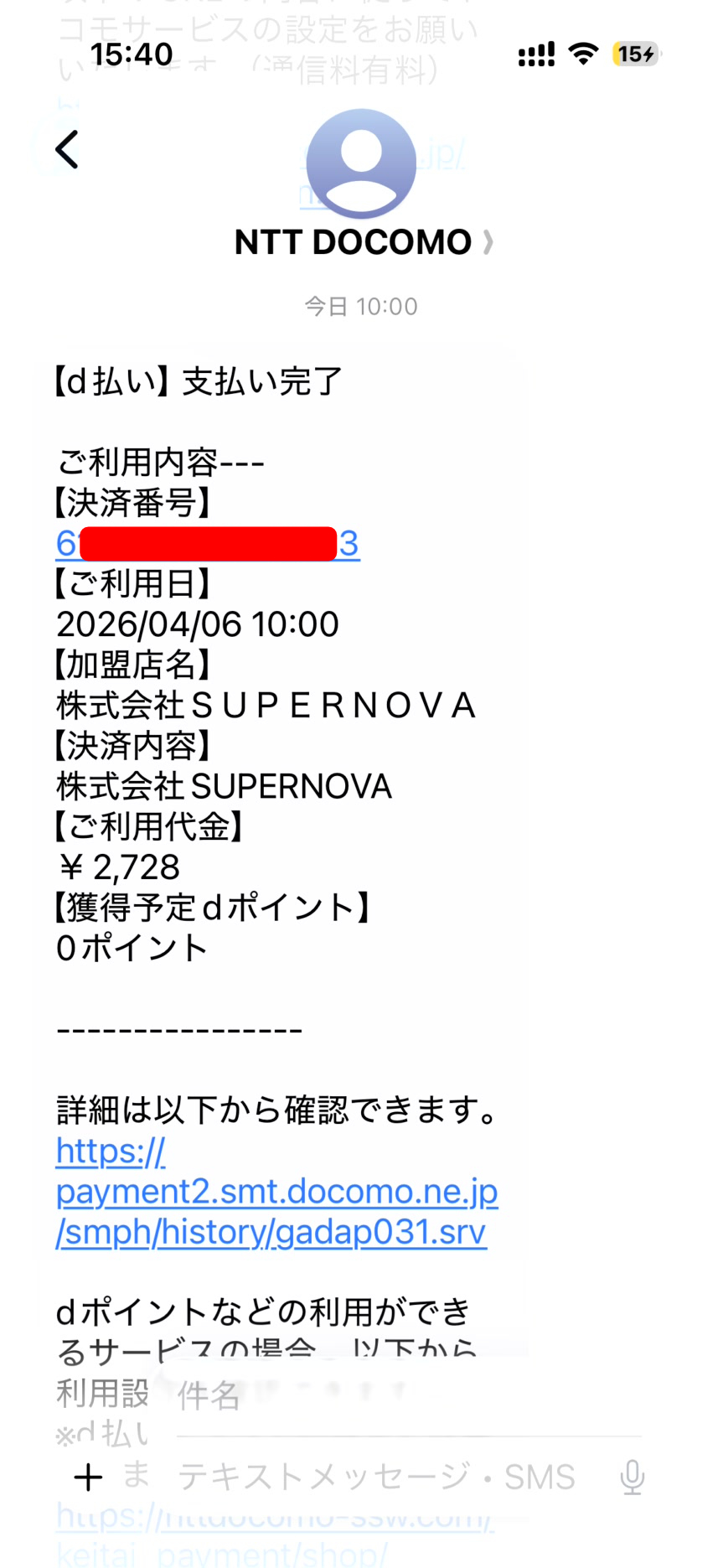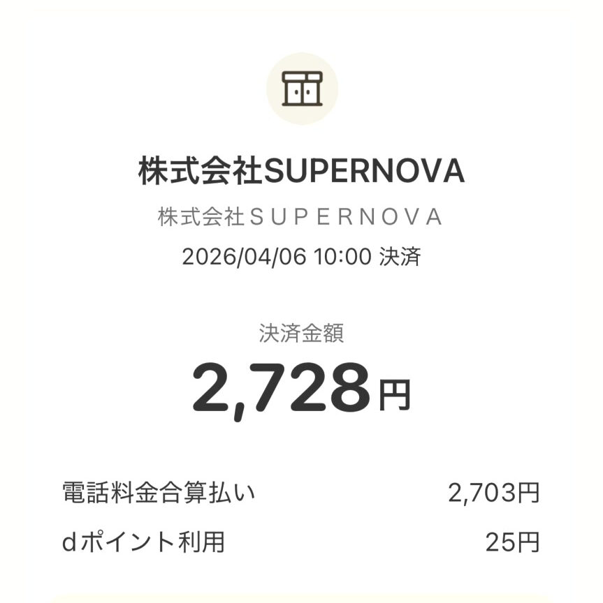 今朝、d払いの利用通知のSMSが届きd払いアプリを見たら、「株式会社SUPERNOVA」から2,728円の請求が来ていて、一瞬かなり焦りました。