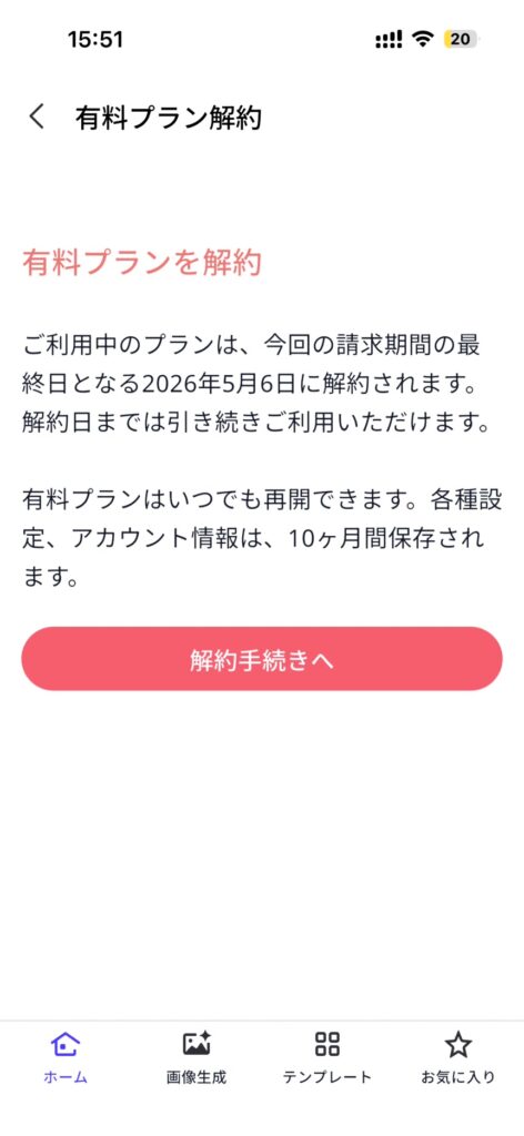 有料プランの解約を行っても課金されて一か月間は利用できるようです。使える間は有効活用しようと思います。