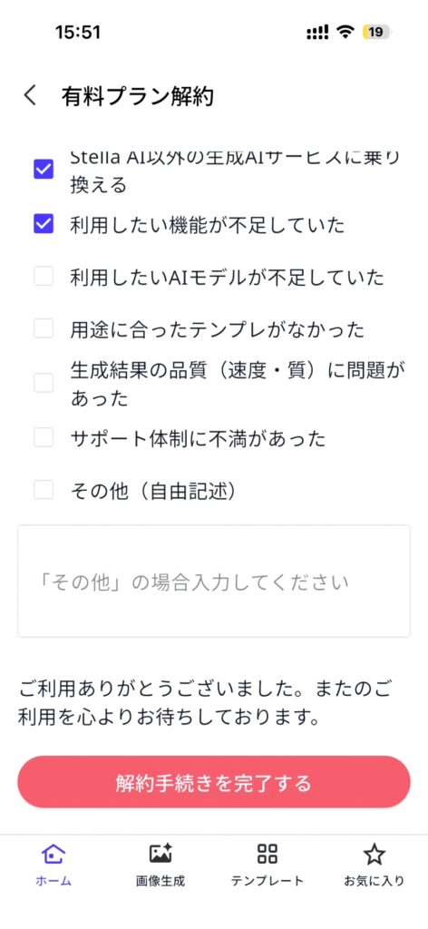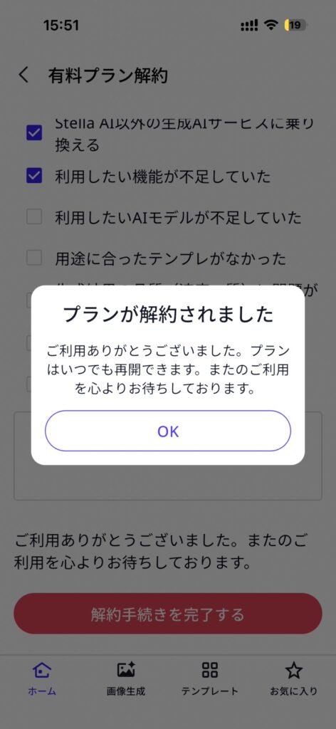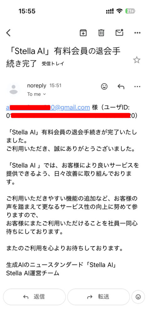 解約後、すぐに 「Stella AI 有料会員の退会手続き完了」 というメールが届きました。
