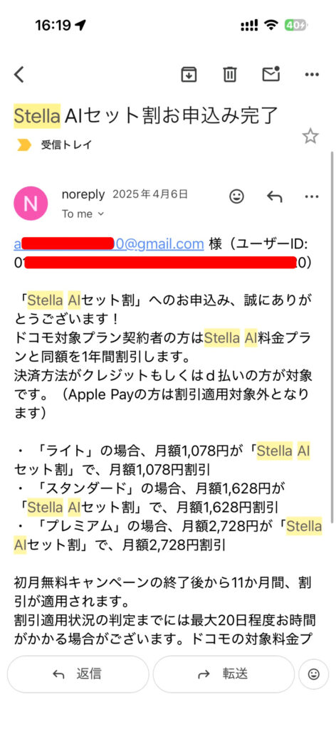 過去に届いていた 「Stella AIセット割お申込み完了」 のメールを見返すと、私が申し込んでいた内容はざっくり次のようなものでした。